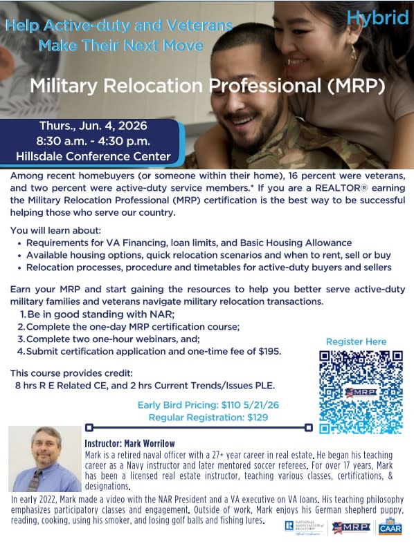 X-ALT-DESC;FMTTYPE=text/html:<!DOCTYPE html><html><head><title></title></head><body aria-disabled="false"><p>Through the Military Relocation Professional (MRP) certification course\, you will learn how to work with current and former military service members to find the housing solutions that best suit their needs and take full advantage of military benefits and support. You will learn how to provide real estate services&mdash\;at any stage in the service member&rsquo\;s military career&mdash\;that meet the needs of this niche market and win future referrals. CE Approved: 8 hrs. Real Estate Related PLE Approved: 2 hrs. Current Industry Issues/Trends Early Bird $110 Fee Deadline: Fri.\, Thurs. May 7th</p><p><br></p><p><img src="https://res.cloudinary.com/micronetonline/image/upload/c_limit\,w_598\,h_787/v1765813460/tenants/92a6d740-3a1b-4f56-b89b-45b1bf3ba6f6/e24fd3a980d5434396cc0c671181a058/Military-Relocation-6-4-2026.jpg" width="791" style="width: 791px\; height: 1041px\; position: relative\; max-width: 100%\; cursor: pointer\; padding: 0px 1px\;" height="1041" fr-original-style="width: 791px\; height: 1041px\;" fr-original-class="fr-draggable"><br></p></body></html>